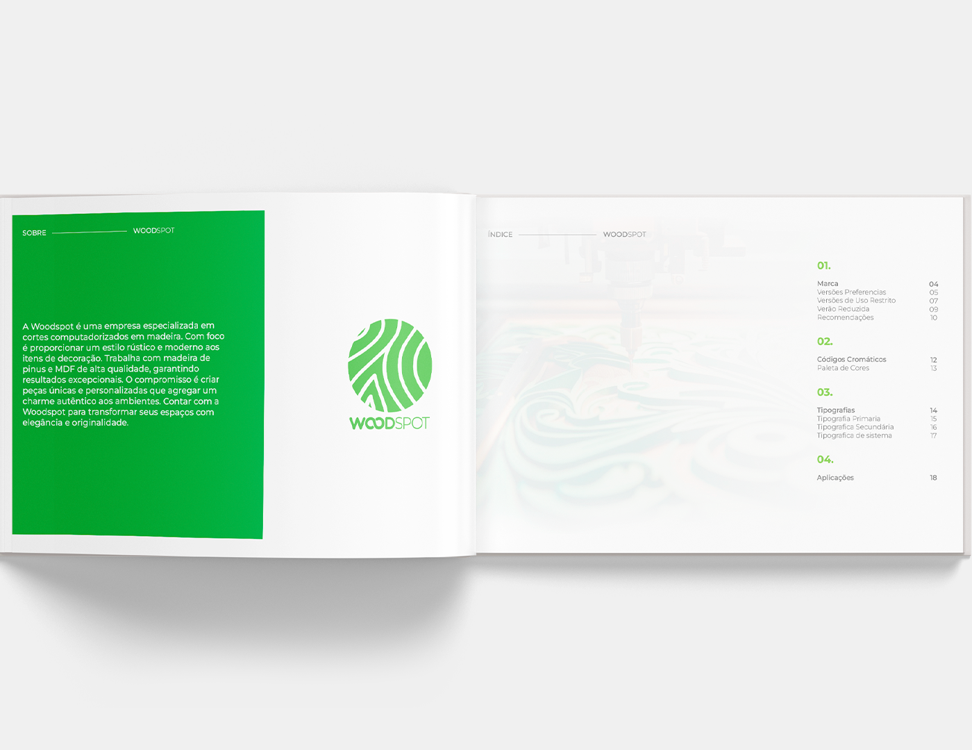 ENG IN THIS PROJECT, I PRESENT THE DEVELOPMENT OF THE COMPLETE VISUAL IDENTITY OF WOODSPOT, A BRAND SPECIALIZED IN PERSONALIZED WOODEN PRODUCTS. THE OBJECTIVE WAS TO CREATE AN IDENTITY THAT CONVEYED SUSTAINABILITY, ARTISANAL QUALITY AND CONNECTION WITH NATURE, DEVELOPING A COHESIVE VISUAL SYSTEM THAT REFLECTS THE BRAND'S VALUES AND CONNECTS WITH ITS TARGET AUDIENCE.