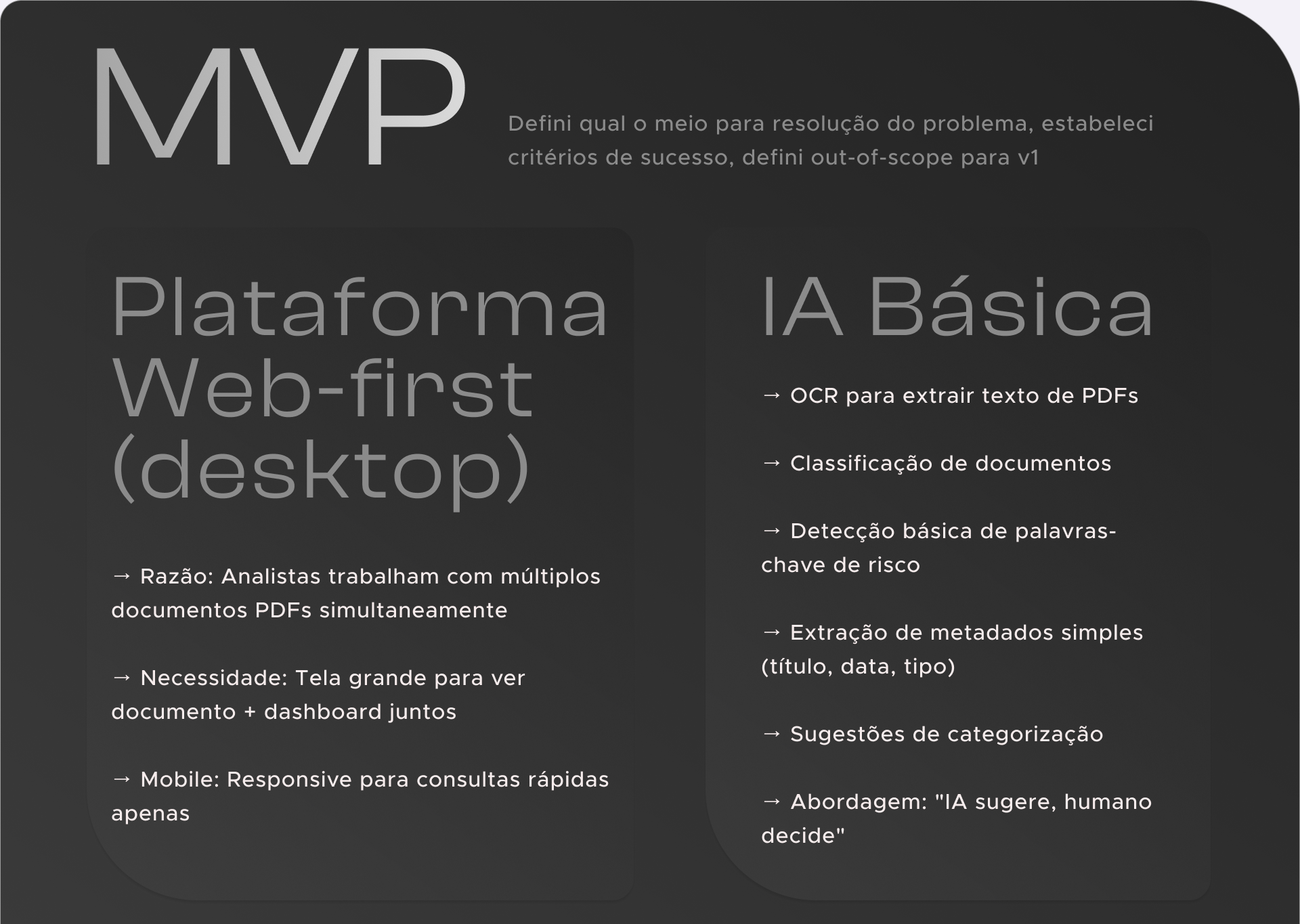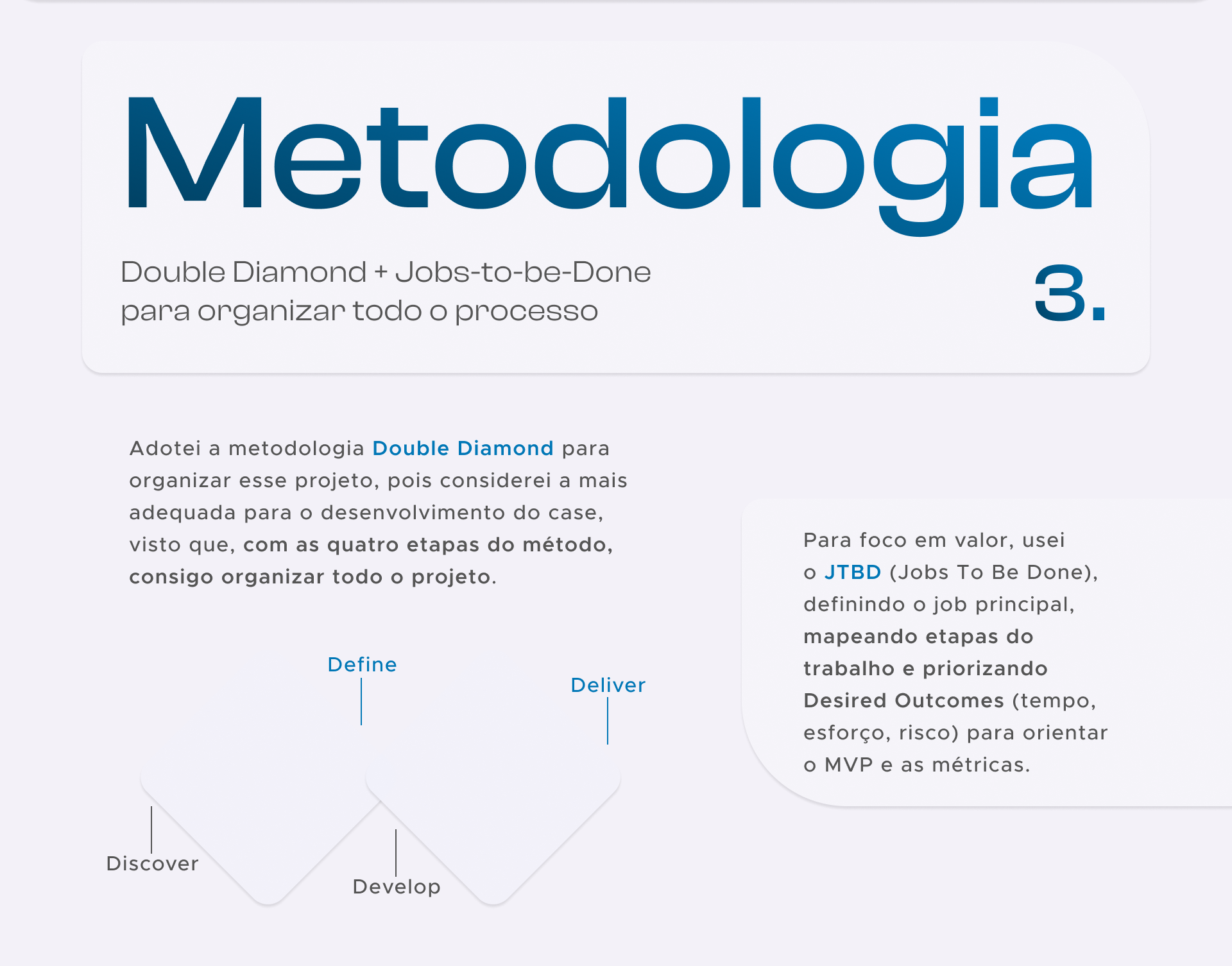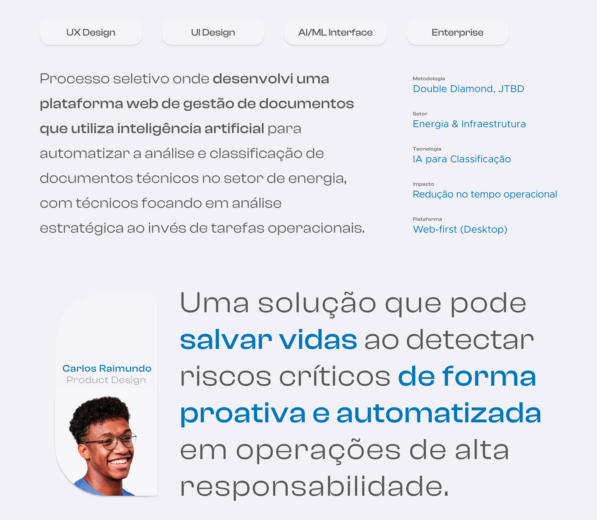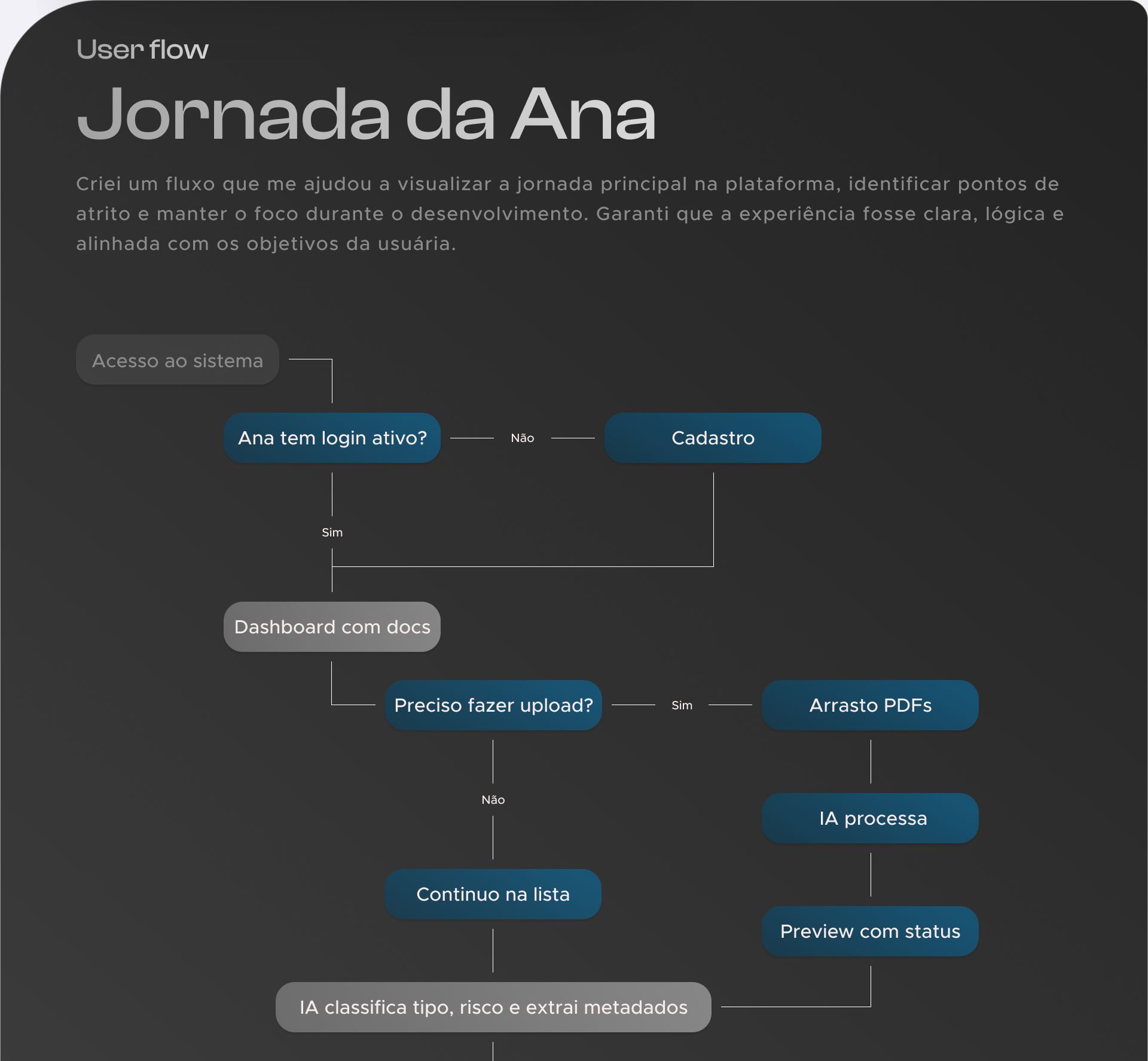 ENG This case study presents a UX Design MVP with AI for analyzing critical documents. Using methodologies such as Double Diamond and JTBD, the project reduced research time and increased decision-making confidence. The project involved benchmarking, personas, user journey, and prototyping, creating a simple and viable solution for high-pressure contexts.